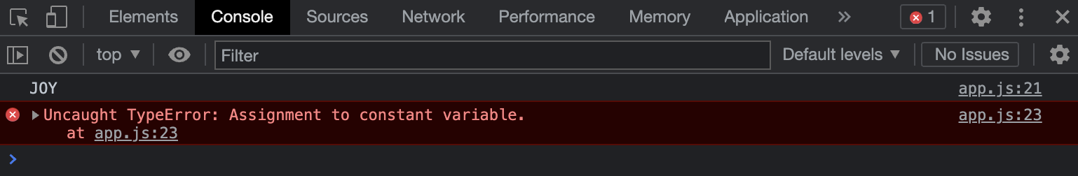 다음과 같이 const로 선언된 변수의 값을 재할당 하게되면 에러가 발생하지만