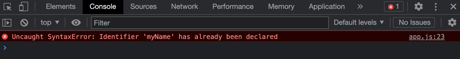 실행 결과를 보면 myName이 이미 선언되었다는 에러 메세지가 나옵니다.(let도 마찬가지)
